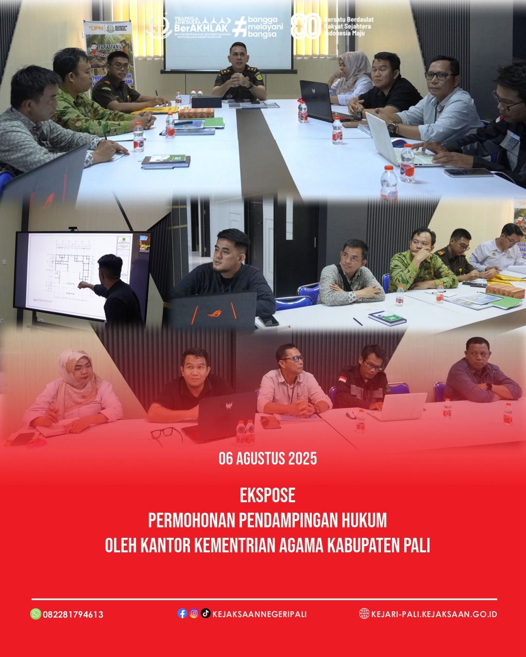 Telah dilaksanakan ekspose/pemaparan atas Permohonan Pendampingan Hukum Kegiatan Rehab Gedung dan Bangunan Kantor Kementerian Agama Kabupaten Penukal Abab Lematang Ilir Tahun 2025 oleh Kasi Bimbingan Masyarakat Islam Kemenag PALI Bapak Ayubi, S.Pd.I, M.Pd. beserta jajaran dan Tim Pelaksana di Ruang Ekspose Seksi Perdata dan Tata Usaha Negara. Kegiatan dipimpin oleh Kepala Seksi Perdata dan Tata Usaha Negara Bapak Patar Daniel Panggabean, SH, MH, didampingi Jaksa Pengacara Negara (JPN) Kejaksaan Negeri PALI.