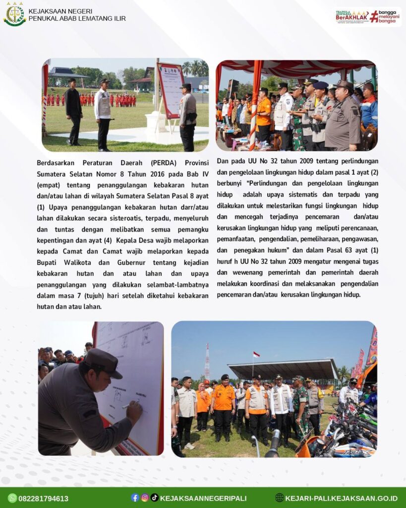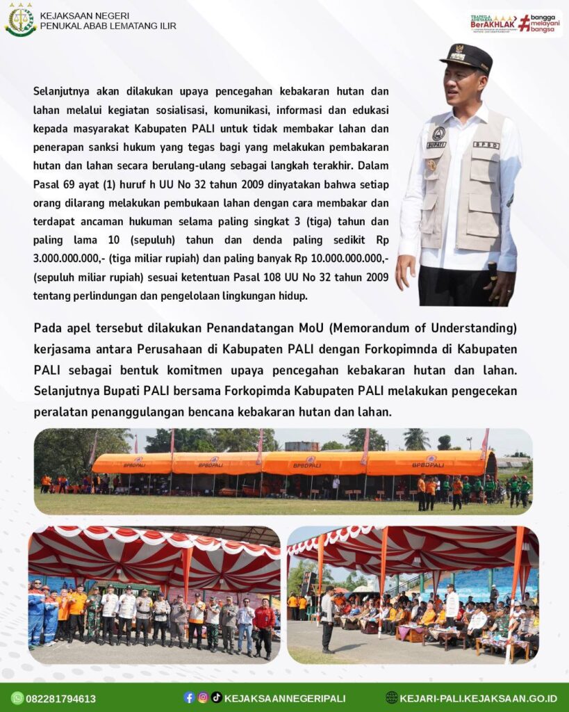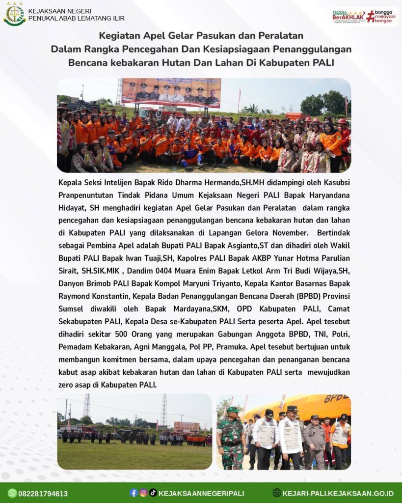 Kepala Seksi Intelijen Bapak Rido Dharma Hermando,SH.MH didampingi oleh Kasubsi Pranpenuntutan Tindak Pidana Umum Kejaksaan Negeri PALI Bapak Haryandana Hidayat, SH menghadiri kegiatan Apel Gelar Pasukan dan Peralatan dalam rangka pencegahan dan kesiapsiagaan penanggulangan bencana kebakaran hutan dan lahan di Kabupaten PALI yang dilaksanakan di Lapangan Gelora November. Bertindak sebagai Pembina Apel adalah Bupati PALI Bapak Asgianto,ST dan dihadiri oleh Wakil Bupati PALI Bapak Iwan Tuaji,SH, Kapolres PALI Bapak AKBP Yunar Hotma Parulian Sirait, SH.SIK.MIK , Dandim 0404 Muara Enim Bapak Letkol Arm Tri Budi Wijaya,SH, Danyon Brimob PALI Bapak Kompol Maryuni Triyanto, Kepala Kantor Basarnas Bapak Raymond Konstantin, Kepala Badan Penanggulangan Bencana Daerah (BPBD) Provinsi Sumsel diwakili oleh Bapak Mardayana,SKM, OPD Kabupaten PALI, Camat Sekabupaten PALI, Kepala Desa se-Kabupaten PALI Serta peserta Apel.