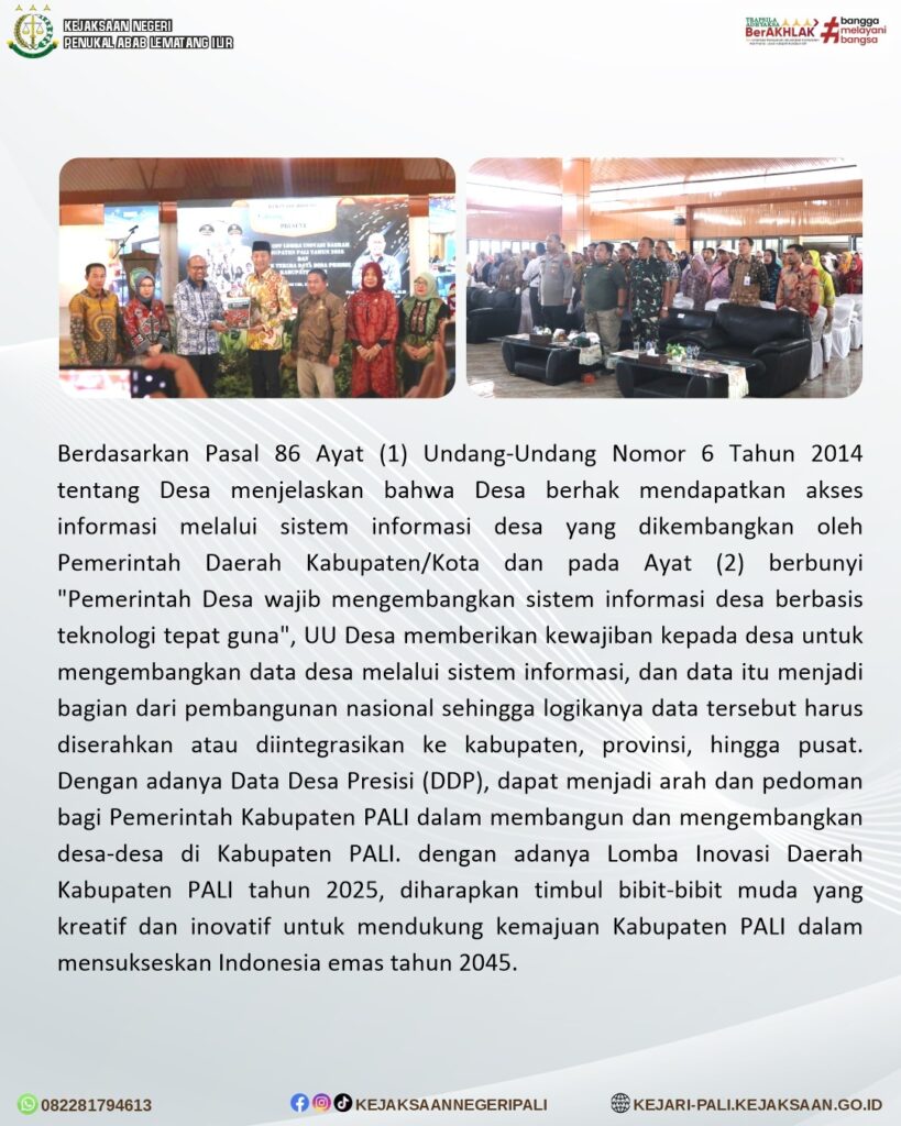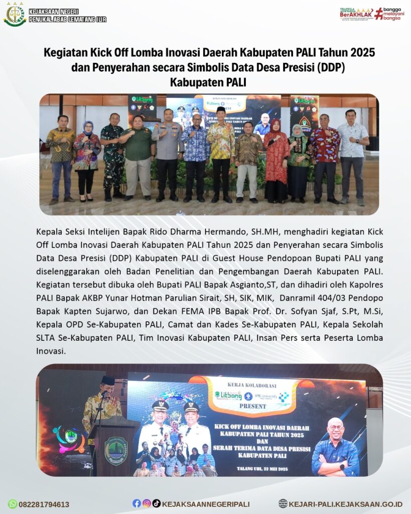 Kepala Seksi Intelijen Bapak Rido Dharma Hermando, SH.MH, menghadiri kegiatan Kick Off Lomba Inovasi Daerah Kabupaten PALI Tahun 2025 dan Penyerahan secara Simbolis Data Desa Presisi (DDP) Kabupaten PALI di Guest House Pendopoan Bupati PALI yang diselenggarakan oleh Badan Penelitian dan Pengembangan Daerah Kabupaten PALI. Kegiatan tersebut dibuka oleh Bupati PALI Bapak Asgianto,ST, dan dihadiri oleh Kapolres PALI Bapak AKBP Yunar Hotman Parulian Sirait, SH, SIK, MIK, Danramil 404/03 Pendopo Bapak Kapten Sujarwo, dan Dekan FEMA IPB Bapak Prof. Dr. Sofyan Sjaf, S.Pt, M.Si, Kepala OPD Se-Kabupaten PALI, Camat dan Kades Se-Kabupaten PALI, Kepala Sekolah SLTA Se-Kabupaten PALI, Tim Inovasi Kabupaten PALI, Insan Pers serta Peserta Lomba Inovasi.
