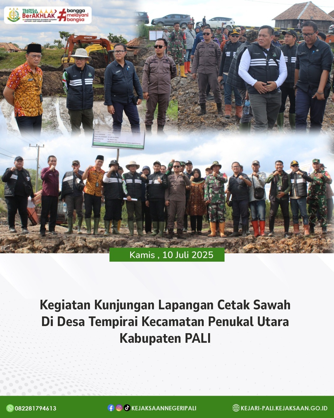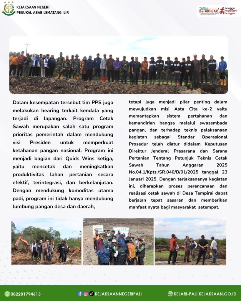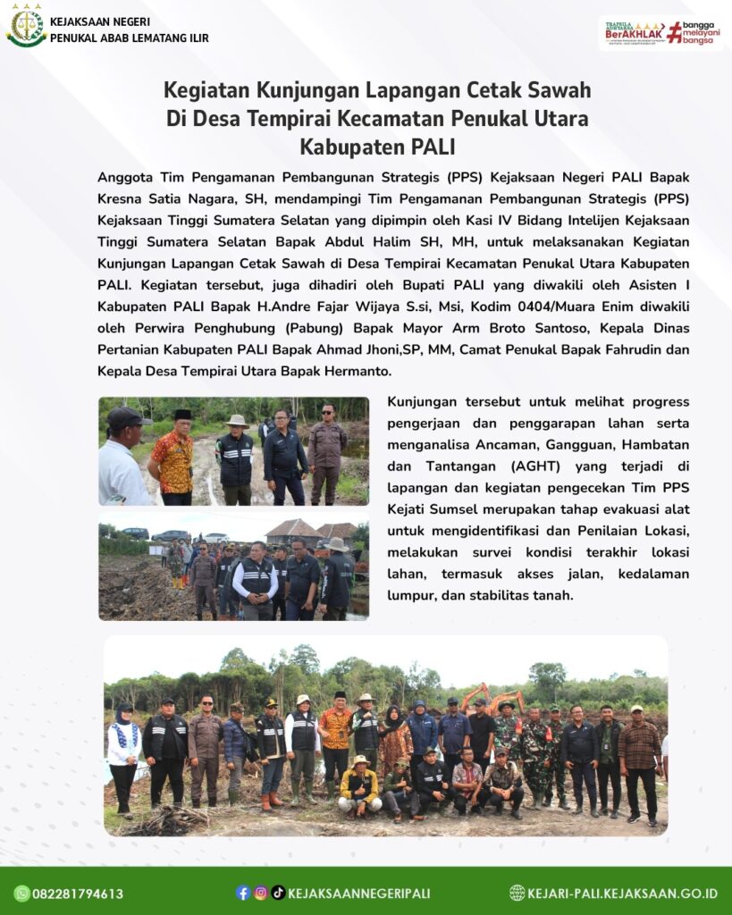 Anggota Tim Pengamanan Pembangunan Strategis (PPS) Kejaksaan Negeri PALI Bapak Kresna Satia Nagara, SH, mendampingi Tim Pengamanan Pembangunan Strategis (PPS) Kejaksaan Tinggi Sumatera Selatan yang dipimpin oleh Kasi IV Bidang Intelijen Kejaksaan Tinggi Sumatera Selatan Bapak Abdul Halim SH, MH, untuk melaksanakan Kegiatan Kunjungan Lapangan Cetak Sawah di Desa Tempirai Kecamatan Penukal Utara Kabupaten PALI. Kegiatan tersebut, juga dihadiri oleh Bupati PALI yang diwakili oleh Asisten I Kabupaten PALI Bapak H.Andre Fajar Wijaya S.Si, M.Si, Kodim 0404/Muara Enim diwakili oleh Perwira Penghubung (Pabung) Bapak Mayor Arm Broto Santoso, Kepala Dinas Pertanian Kabupaten PALI Bapak Ahmad Jhoni,SP, MM, Camat Penukal Bapak Fahrudin dan Kepala Desa Tempirai Utara Bapak Hermanto.
