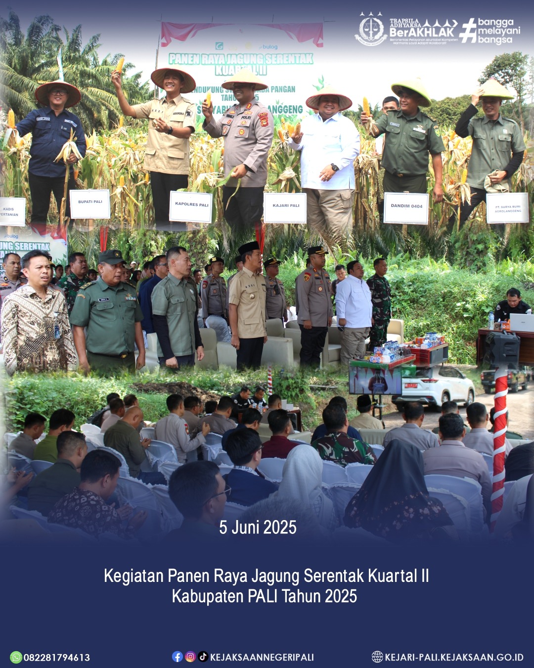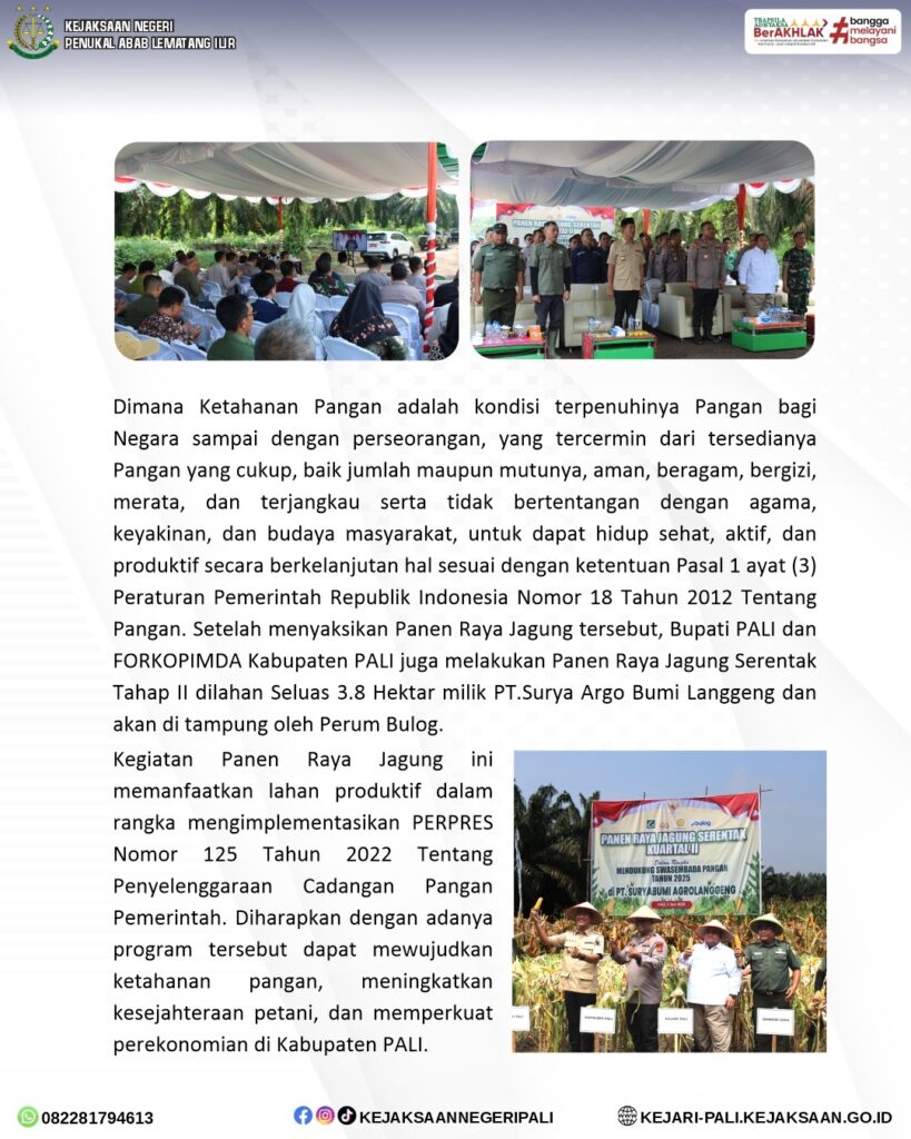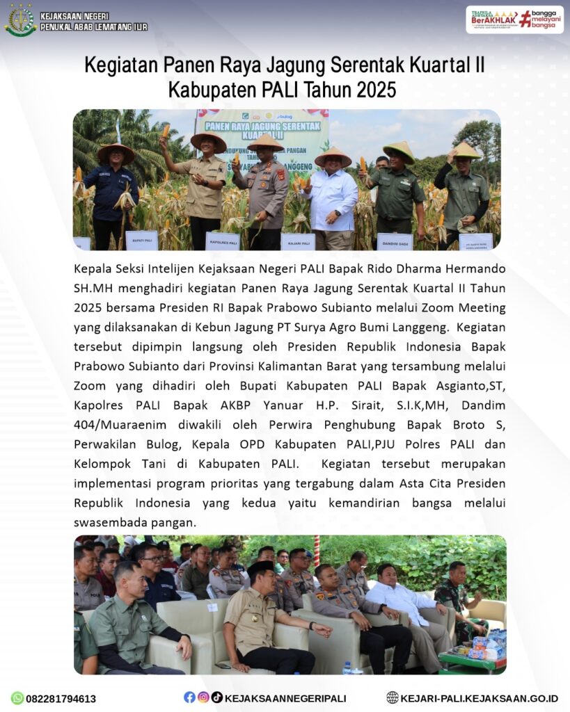 Kepala Seksi Intelijen Kejaksaan Negeri PALI Bapak Rido Dharma Hermando SH.MH menghadiri kegiatan Panen Raya Jagung Serentak Kuartal II Tahun 2025 bersama Presiden RI Bapak Prabowo Subianto melalui Zoom Meeting yang dilaksanakan di Kebun Jagung PT Surya Agro Bumi Langgeng. Kegiatan tersebut dipimpin langsung oleh Presiden Republik Indonesia Bapak Prabowo Subianto dari Provinsi Kalimantan Barat yang tersambung melalui Zoom yang dihadiri oleh Bupati Kabupaten PALI Bapak Asgianto,ST, Kapolres PALI Bapak AKBP Yanuar H.P. Sirait, S.I.K,MH, Dandim 404/Muaraenim diwakili oleh Perwira Penghubung Bapak Broto S, Perwakilan Bulog, Kepala OPD Kabupaten PALI,PJU Polres PALI dan Kelompok Tani di Kabupaten PALI.