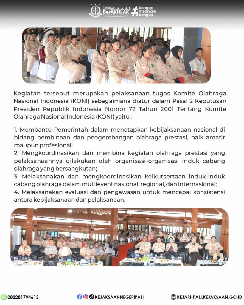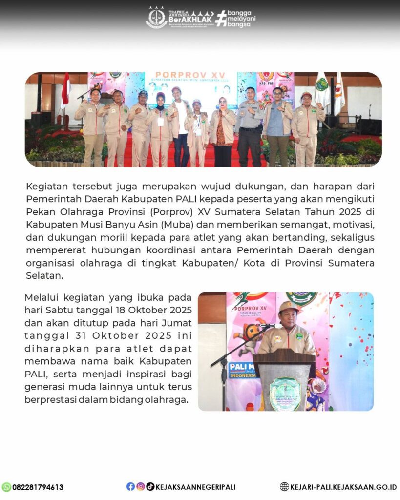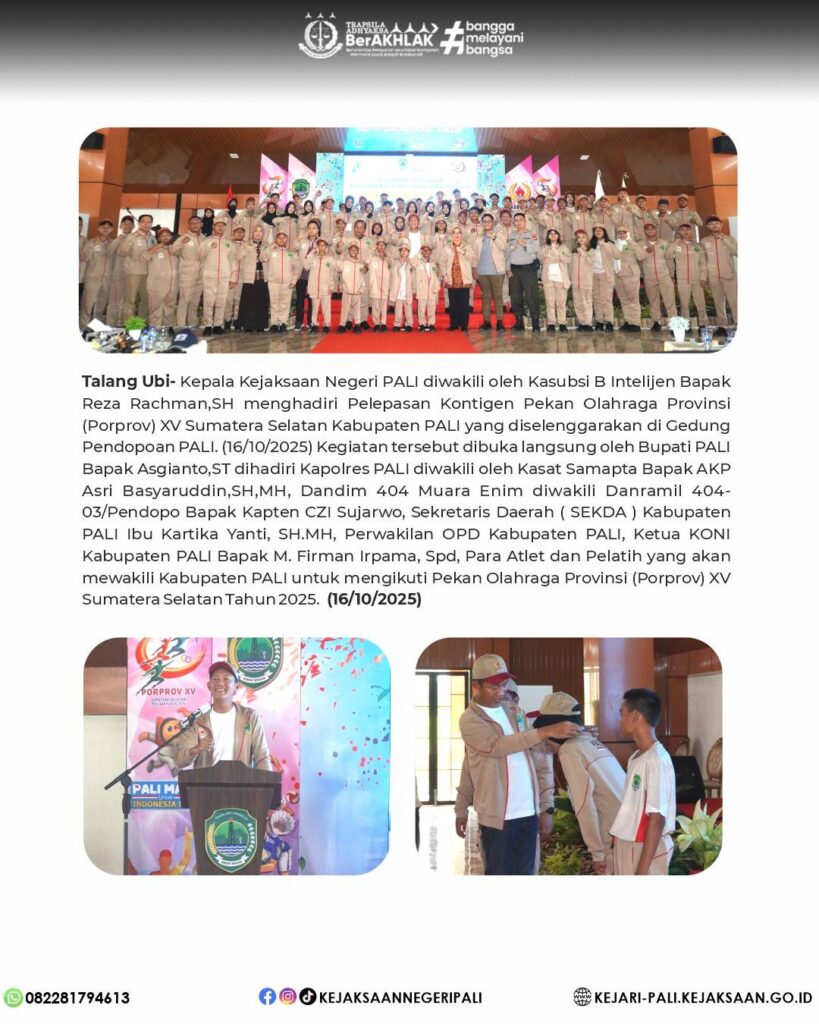 Kepala Kejaksaan Negeri PALI diwakili oleh Kasubsi B Intelijen Bapak Reza Rachman,SH menghadiri Pelepasan Kontigen Pekan Olahraga Provinsi (Porprov) XV Sumatera Selatan Kabupaten PALI yang diselenggarakan di Gedung Pendopoan PALI. (16/10/2025)