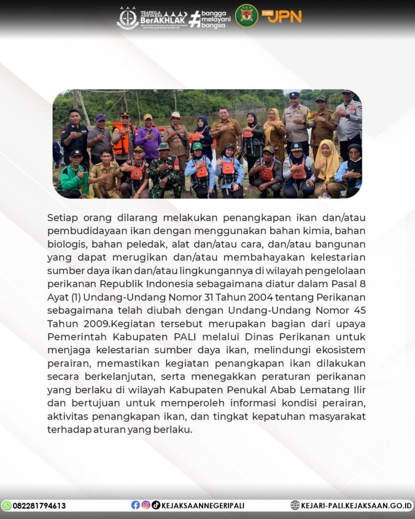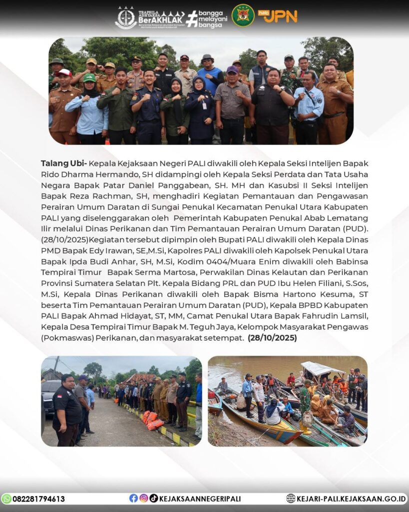 Kepala Kejaksaan Negeri PALI diwakili oleh Kepala Seksi Intelijen Bapak Rido Dharma Hermando, SH didampingi oleh Kepala Seksi Perdata dan Tata Usaha Negara Bapak Patar Daniel Panggabean, SH. MH dan Kasubsi II Seksi Intelijen Bapak Reza Rachman, SH, menghadiri Kegiatan Pemantauan dan Pengawasan Perairan Umum Daratan di Sungai Penukal Kecamatan Penukal Utara Kabupaten PALI yang diselenggarakan oleh Pemerintah Kabupaten Penukal Abab Lematang Ilir melalui Dinas Perikanan dan Tim Pemantauan Perairan Umum Daratan (PUD).(28/10/2025)
