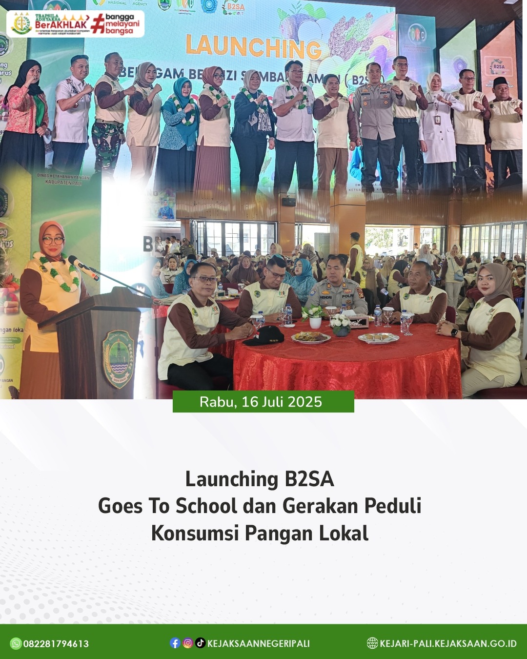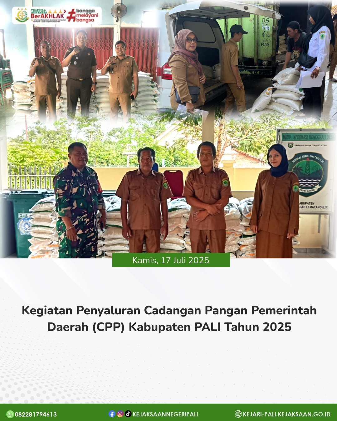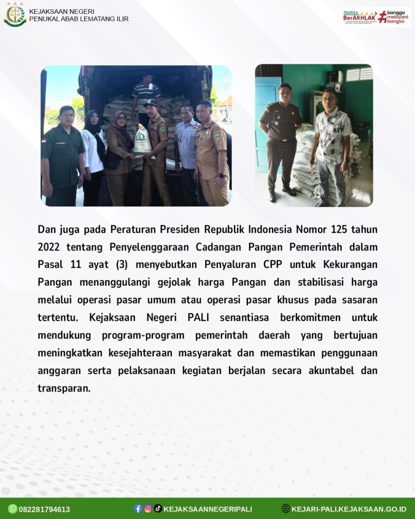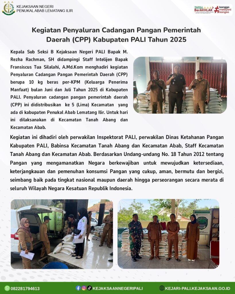 Kepala Sub Seksi B Kejaksaan Negeri PALI Bapak M. Rezha Rachman, SH didampingi Staff Intelijen Bapak Fransiscus Tua Silalahi, A.Md.Kom menghadiri kegiatan Penyaluran Cadangan Pangan Pemerintah Daerah (CPP) berupa 10 kg beras per-KPM (Keluarga Penerima Manfaat) bulan Juni dan Juli Tahun 2025 di Kabupaten PALI. Penyaluran cadangan pangan pemerintah daerah (CPP) ini didistribusikan ke 5 (Lima) Kecamatan yang ada di kabupaten Penukal Abab Lematang Ilir. Untuk hari ini dilaksanakan di Kecamatan Tanah Abang dan Kecamatan Abab. Kegiatan ini dihadiri oleh perwakilan Inspektorat PALI, perwakilan Dinas Ketahanan Pangan Kabupaten PALI, Babinsa Kecamatan Tanah Abang dan Kecamatan Abab, Staff Kecamatan Tanah Abang dan Kecamatan Abab.