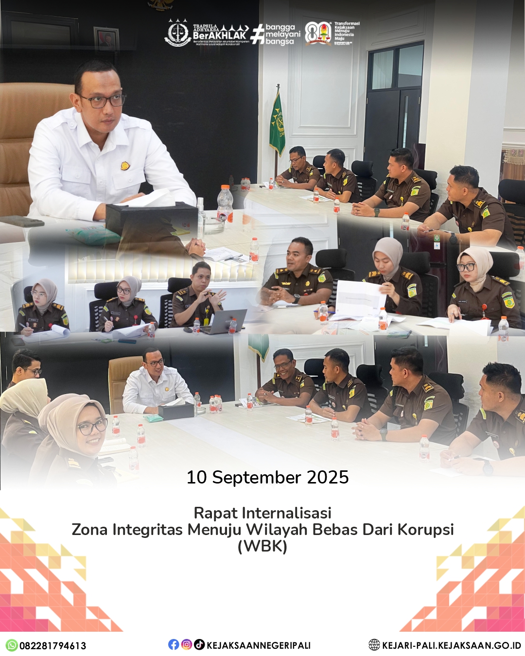 Telah dilaksanakan kegiatan Rapat Internalisasi Pembangunan Zona Integritas Menuju Wilayah Bebas dari Korupsi (WBK) di lingkungan Kejaksaan Negeri PALI.(10/09/2025) Kegiatan ini dimulai dengan internalisasi oleh Area 3 yaitu Penataan Manajemen SDM yang paparannya dilaksanakan oleh Anggota Area 3 secara bergantian dengan dibuka oleh Kepala Sub Bagian Pembinaan Bapak Widodo Sudarsono, SH. Kemudian dilanjutkan internalisasi Area 4 yaitu Akuntabilitas yang paparannya dilaksanakan oleh Anggota Area 4, yaitu Bapak Zefta Adetya, S.Si. Kegiatan tersebut dihadiri oleh Kepala Kejaksaan Negeri PALI Bapak Farriman Isandi Siregar, SH, MH, yang diikuti oleh seluruh Anggota Area 3 dan Area 4.