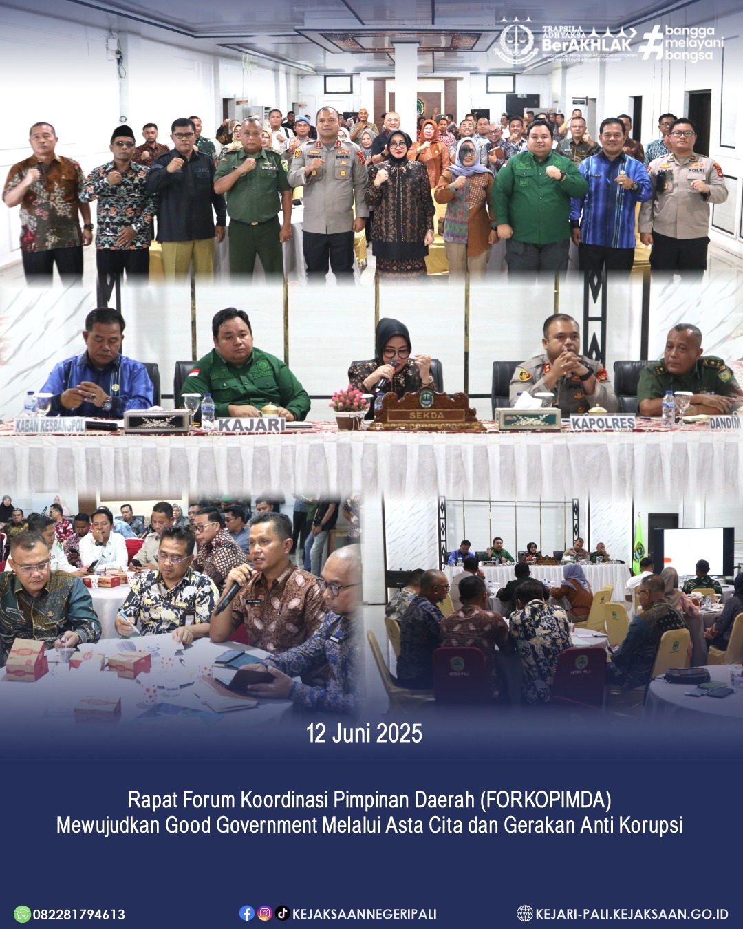 Kasubsi A Intelijen Kejaksaan Negeri PALI Bapak Judistira Yusticia, SH, MH, menghadiri Kegiatan Rapat ke-8 Paripurna DPRD Kabupaten PALI tentang Pembahasan Rancangan Peraturan Daerah Tentang Rencana Pembangunan Jangka Menengah Daerah (RPJMD) Tahun Anggaran 2025-2029 yang dilaksanakan di Ruang Rapat Paripurna DPRD Kabupaten PALI. Kegiatan tersebut dibuka oleh Bupati Kabupaten PALI Bapak Asgianto, ST dan dihadiri oleh Ketua DPRD Kabupaten PALI Bapak H. Ubaidillah, SH, Wakil Ketua I DPRD Kabupaten PALI Bapak H. Kristian, SM, Kapolres PALI diwakili oleh Kasat Intelkam Bapak IPTU Eko Purnomo, Sekretaris Daerah Kabupaten PALI Ibu Kartika Yanti, SH, MH, Staf Ahli Bupati Bidang Kemasyarakatan dan SDM Bapak Drs.Kusmayadi, Staf Ahli Bupati Bidang Ekonomi, Pembangunan, dan Keuangan Bapak Drs Agen Eleidi, Asisten I Bapak H.Andre F.W, S.si, M.si, Asisten II Bapak Rizal Pahlewi, AP,M.si, Asisten III Bapak Haryono, SH,MH, dan OPD terkait.