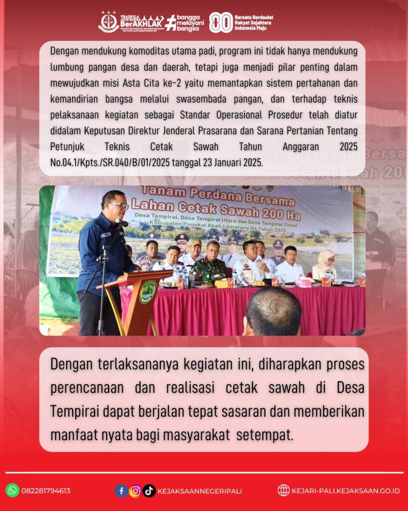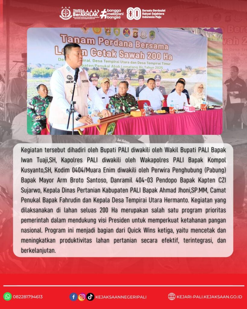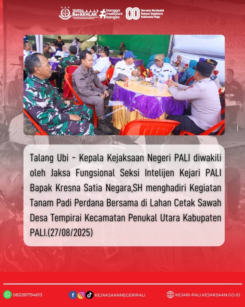Kepala Kejaksaan Negeri PALI diwakili oleh Jaksa Fungsional Bapak Kresna Satia Negara ,SH menghadiri Kegiatan Tanam Perdana Bersama Padi di Lahan Cetak Sawah di Desa Tempirai Kecamatan Penukal Utara Kabupaten PALI. (27/08/2025)