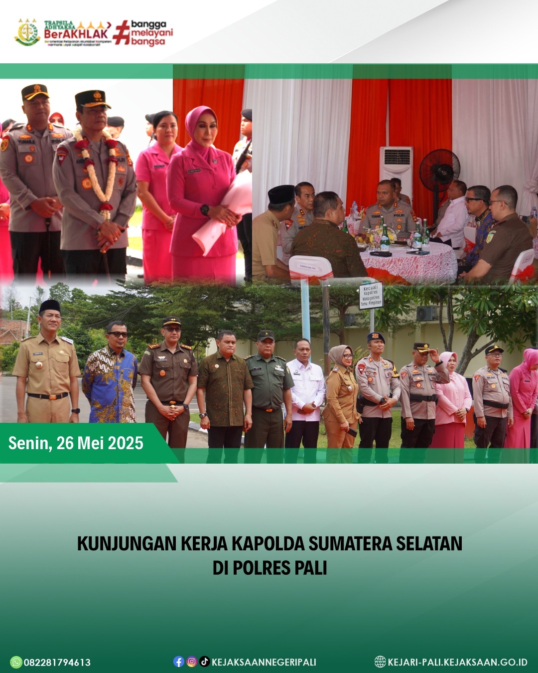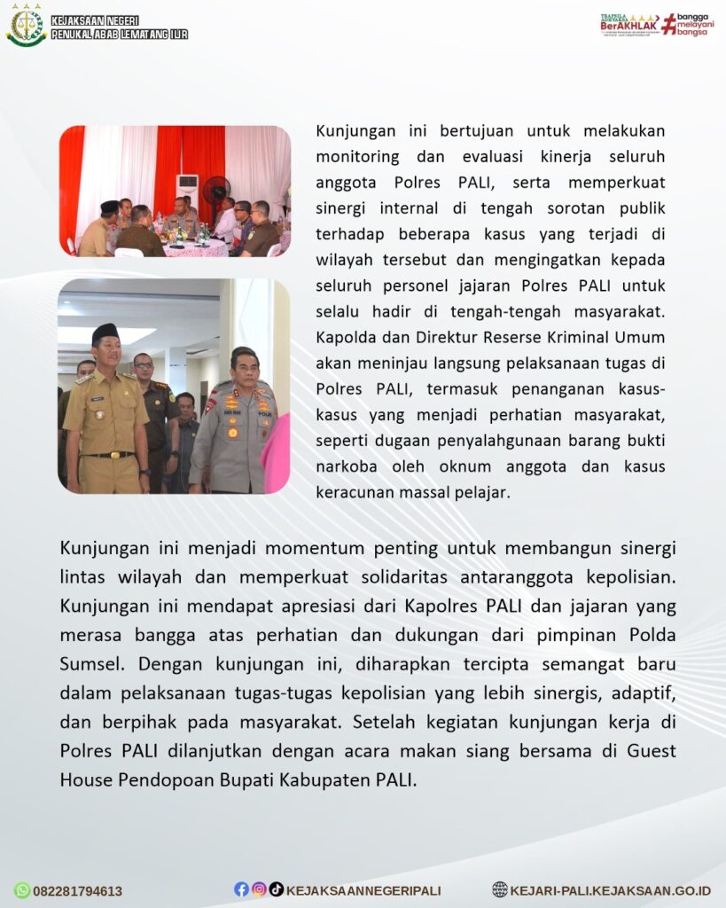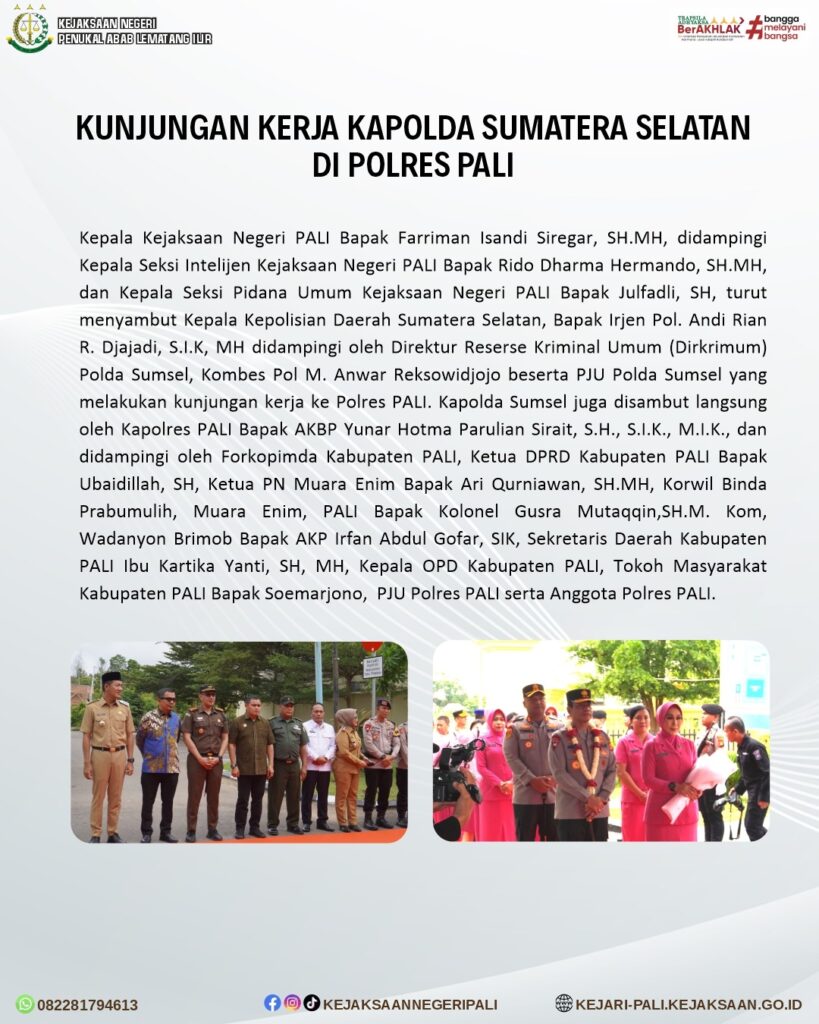 kepala Kejaksaan Negeri PALI Bapak Farriman Isandi Siregar, SH.MH, didampingi Kepala Seksi Intelijen Kejaksaan Negeri PALI Bapak Rido Dharma Hermando, SH.MH, dan Kepala Seksi Pidana Umum Kejaksaan Negeri PALI Bapak Julfadli, SH, turut menyambut Kepala Kepolisian Daerah Sumatera Selatan, Bapak Irjen Pol. Andi Rian R. Djajadi, S.I.K, MH didampingi oleh Direktur Reserse Kriminal Umum (Dirkrimum) Polda Sumsel, Kombes Pol M. Anwar Reksowidjojo beserta PJU Polda Sumsel yang melakukan kunjungan kerja ke Polres PALI. Kapolda Sumsel juga disambut langsung oleh Kapolres PALI Bapak AKBP Yunar Hotma Parulian Sirait, S.H., S.I.K., M.I.K., dan didampingi oleh Forkopimda Kabupaten PALI, Ketua DPRD Kabupaten PALI Bapak Ubaidillah, SH, Ketua PN Muara Enim Bapak Ari Qurniawan, SH.MH, Korwil Binda Prabumulih, Muara Enim, PALI Bapak Kolonel Gusra Mutaqqin,SH.M. Kom, Wadanyon Brimob Bapak AKP Irfan Abdul Gofar, SIK, Sekretaris Daerah Kabupaten PALI Ibu Kartika Yanti, SH, MH, Kepala OPD Kabupaten PALI, Tokoh Masyarakat Kabupaten PALI Bapak Soemarjono, PJU Polres PALI serta Anggota Polres PALI.