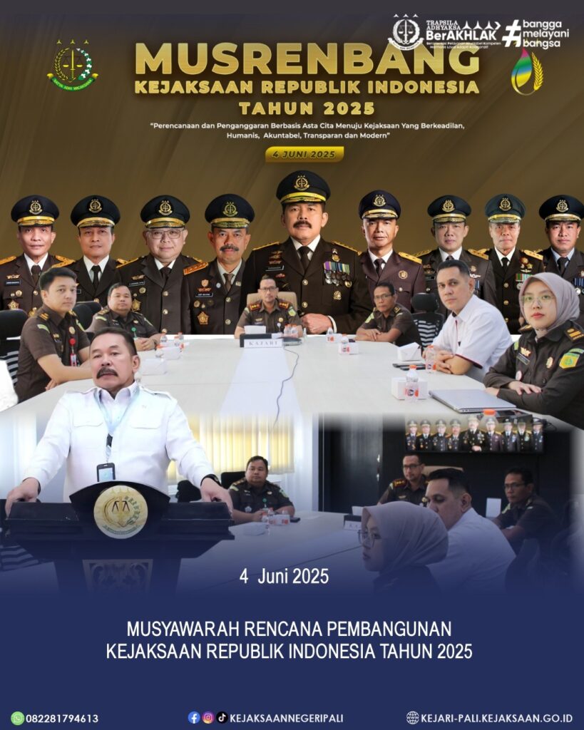 Kepala Kejaksaan Negeri PALI Bapak Farriman Isandi Siregar, SH, MH didampingi Kasubagbin, Para Kasi dan Kasubsi mengikuti zoom meeting Pembukaan Musrenbang Kejaksaan RI Tahun 2025 dengan mengusung tema “Perencanaan dan Penganggaran Berbasis Asta Cita Menuju Kejaksaan yang Berkeadilan, Humanis, Akuntabel, Transparan dan Modern. Zoom tersebut dibuka langsung oleh Jaksa Agung RI Bapak Prof. Dr. ST. Burhanuddin, SH, MH yang diikuti oleh seluruh Pejabat Utama Kejagung RI, Kejati, dan Kejari se- Indonesia.