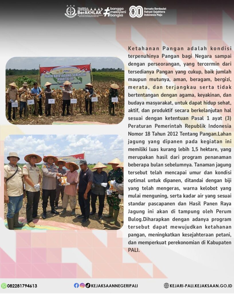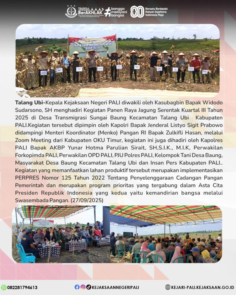 Kepala Kejaksaan Negeri PALI diwakili oleh Kasubagbin Bapak Widodo Sudarsono, SH menghadiri Kegiatan Panen Raya Jagung Serentak Kuartal III Tahun 2025 di Desa Transmigrasi Sungai Baung Kecamatan Talang Ubi Kabupaten PALI.