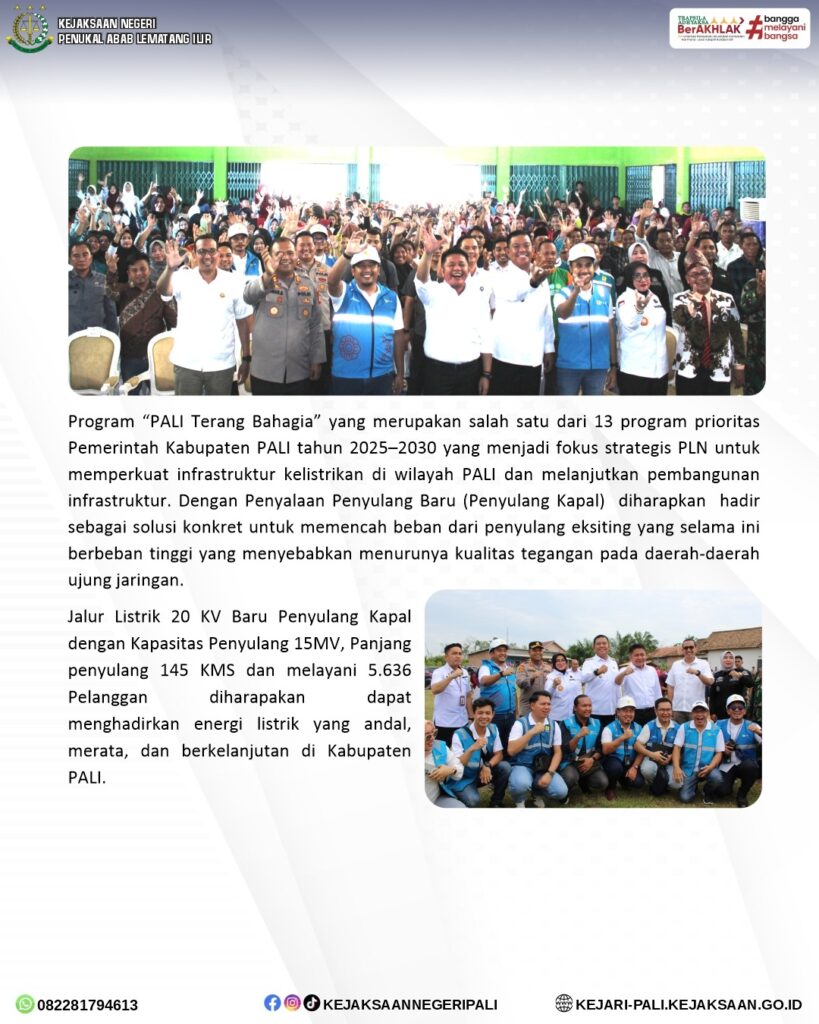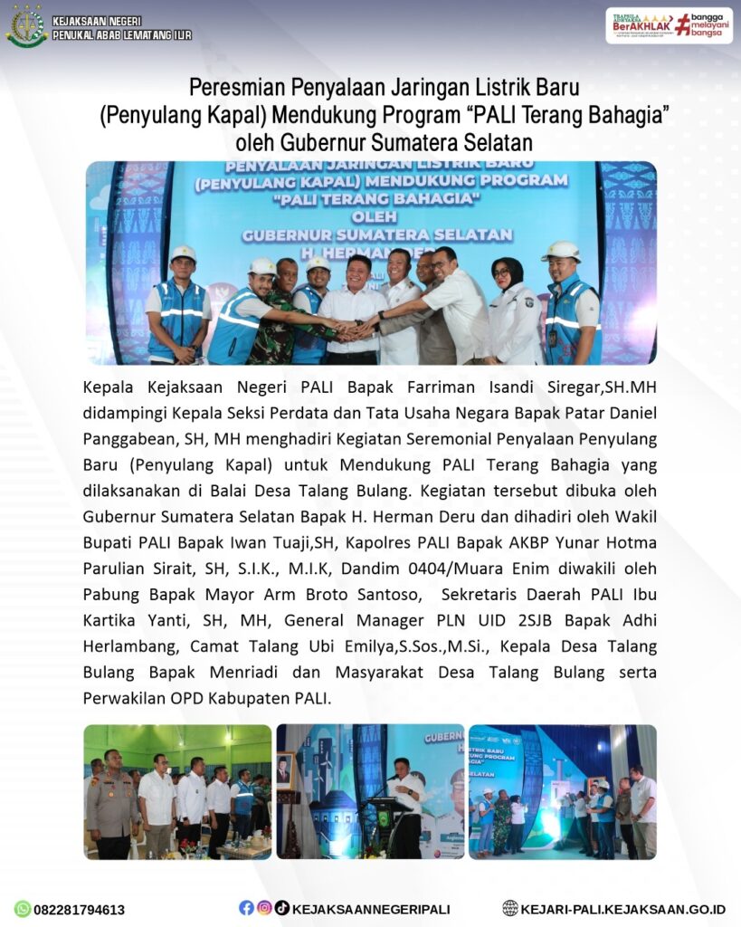 Kepala Kejaksaan Negeri PALI Bapak Farriman Isandi Siregar,SH.MH didampingi Kepala Seksi Perdata dan Tata Usaha Negara Bapak Patar Daniel Panggabean, SH, MH menghadiri Kegiatan Seremonial Penyalaan Penyulang Baru (Penyulang Kapal) untuk Mendukung PALI Terang Bahagia yang dilaksanakan di Balai Desa Talang Bulang. Kegiatan tersebut dibuka oleh Gubernur Sumatera Selatan Bapak H. Herman Deru dan dihadiri oleh Wakil Bupati PALI Bapak Iwan Tuaji,SH, Kapolres PALI Bapak AKBP Yunar Hotma Parulian Sirait, SH, S.I.K., M.I.K, Dandim 0404/Muara Enim diwakili oleh Pabung Bapak Mayor Arm Broto Santoso, Sekretaris Daerah PALI Ibu Kartika Yanti, SH, MH, General Manager PLN UID 2SJB Bapak Adhi Herlambang, Camat Talang Ubi Emilya,S.Sos.,M.Si., Kepala Desa Talang Bulang Bapak Menriadi dan Masyarakat Desa Talang Bulang serta Perwakilan OPD Kabupaten PALI.