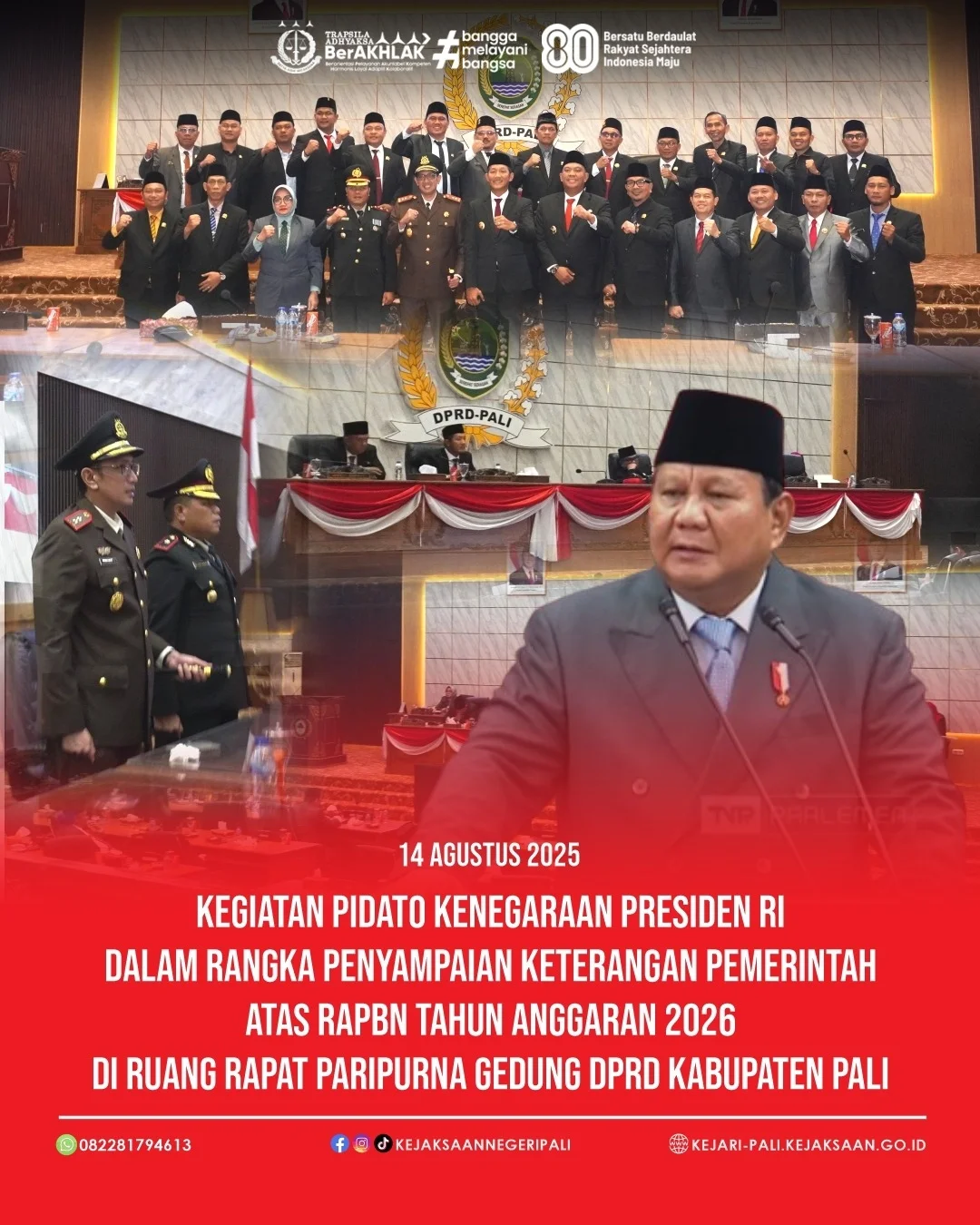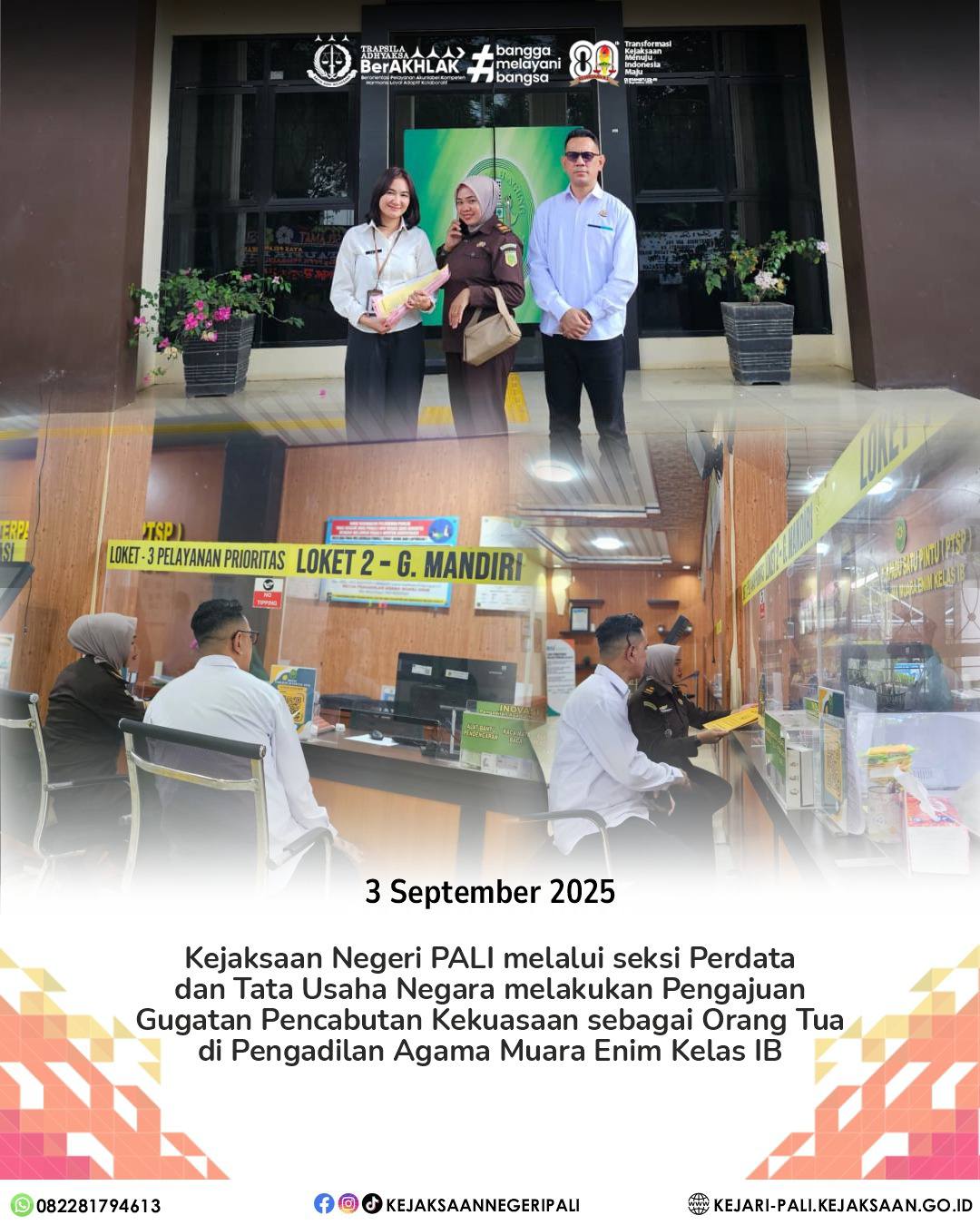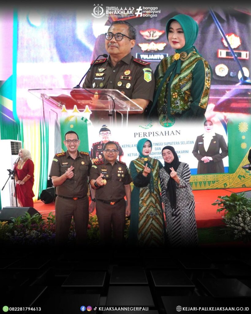 Kepala Kejaksaan Negeri PALI Bapak Farriman Isandi Siregar, SH, MH didampingi Ketua IAD Daerah PALI Ny. Farah Farriman beserta jajaran menghadiri kegiatan Perpisahan Kepala Kejaksaan Tinggi Sumatera Selatan Bapak Dr. Yulianto, SH, MH, dan Ketua IAD Wilayah Sumatera Selatan Ny. Yessi Yulianto. (22/10/2025)