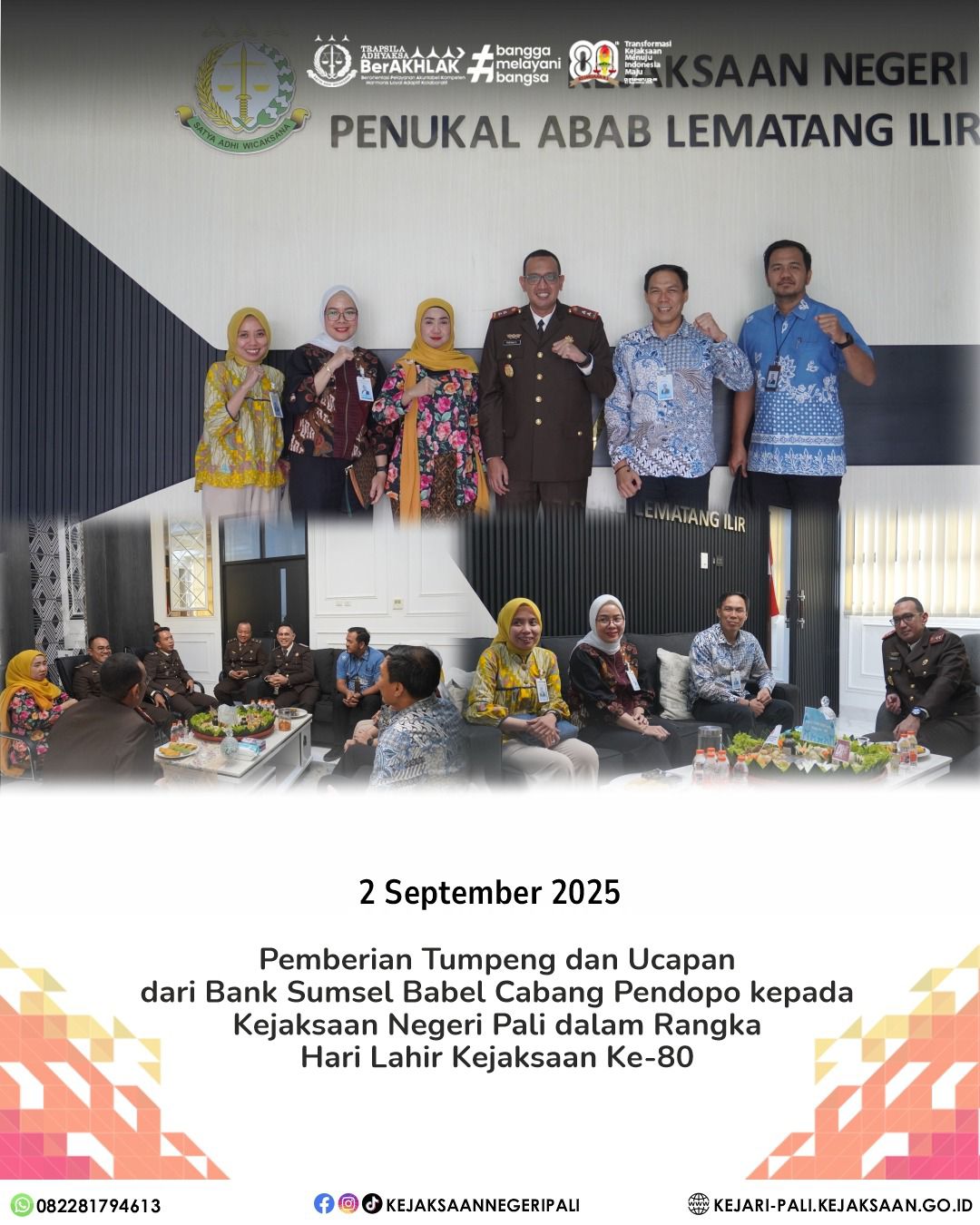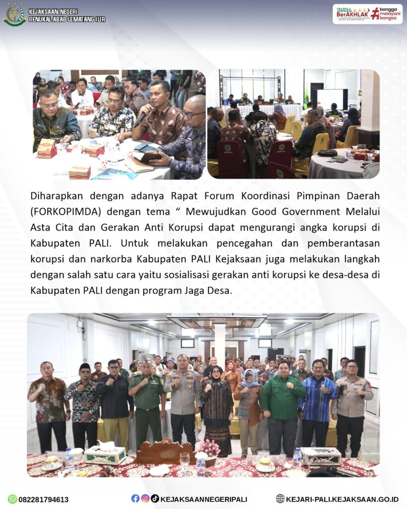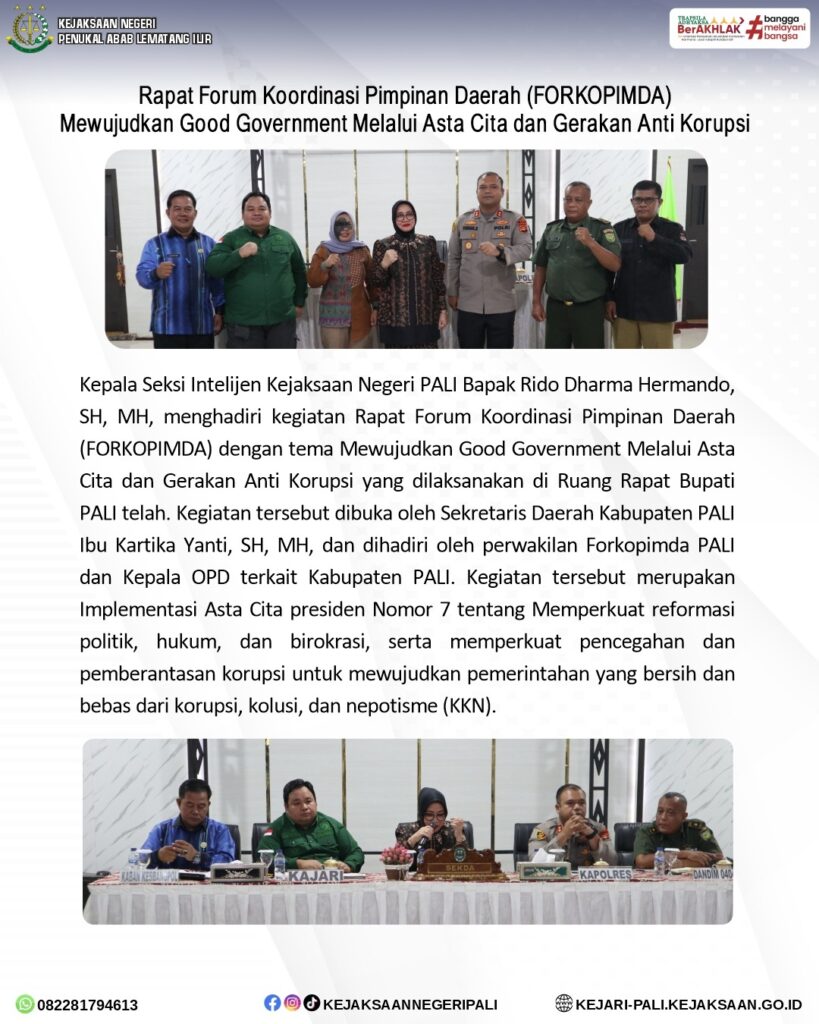 Kepala Seksi Intelijen Kejaksaan Negeri PALI Bapak Rido Dharma Hermando, SH, MH, menghadiri kegiatan Rapat Forum Koordinasi Pimpinan Daerah (FORKOPIMDA) dengan tema Mewujudkan Good Government Melalui Asta Cita dan Gerakan Anti Korupsi yang dilaksanakan di Ruang Rapat Bupati PALI telah. Kegiatan tersebut dibuka oleh Sekretaris Daerah Kabupaten PALI Ibu Kartika Yanti, SH, MH, dan dihadiri oleh perwakilan Forkopimda PALI dan Kepala OPD dan Camat se- Kabupaten PALI.