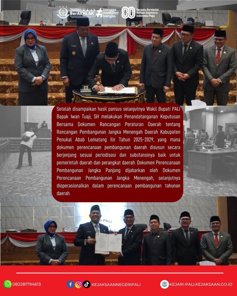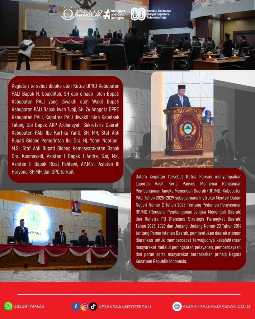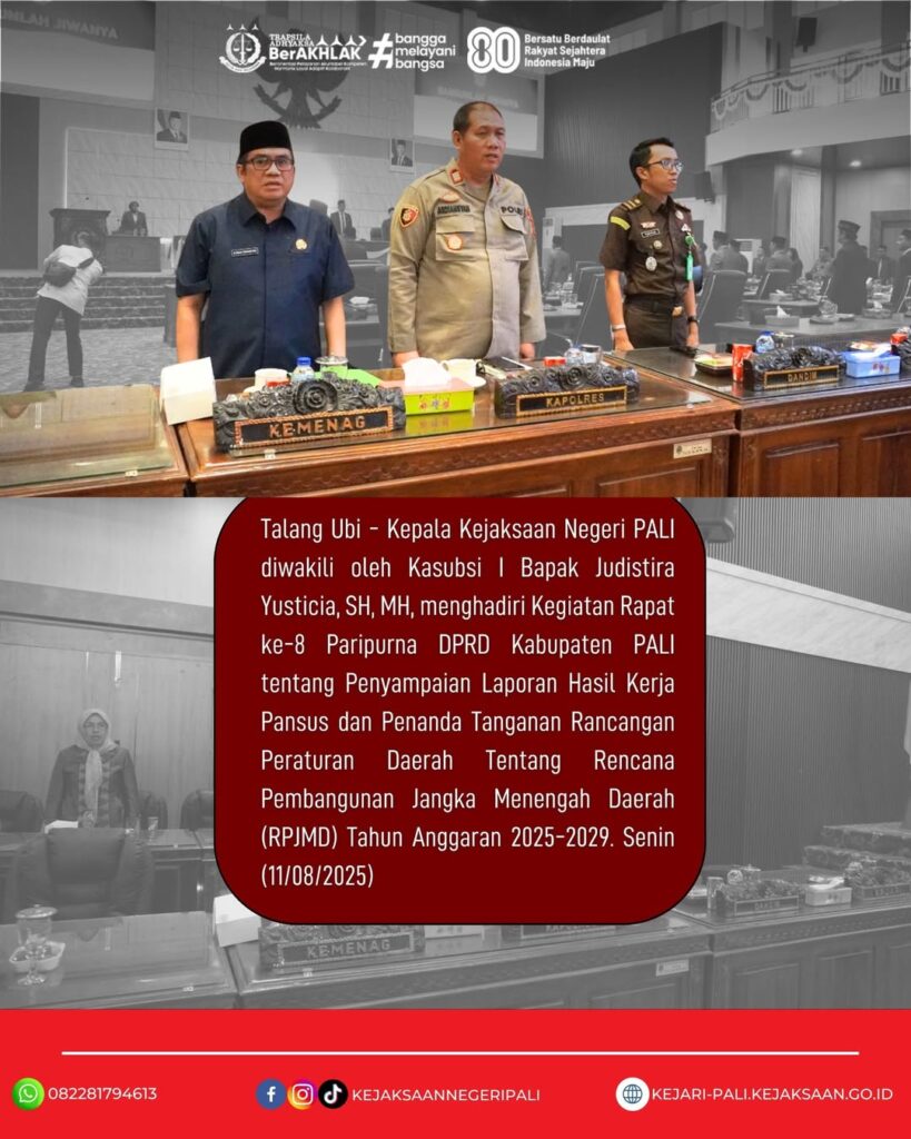 Kepala Kejaksaan Negeri PALI diwakili oleh Kasubsi A Bapak Judistira Yusticia, SH, MH, menghadiri Kegiatan Rapat ke-8 Paripurna DPRD Kabupaten PALI tentang Penyampaian Laporan Hasil Kerja Pansus dan Penanda Tanganan Rancangan Peraturan Daerah Tentang Rencana Pembangunan Jangka Menengah Daerah (RPJMD) Tahun Anggaran 2025-2029. (11/08/2025)