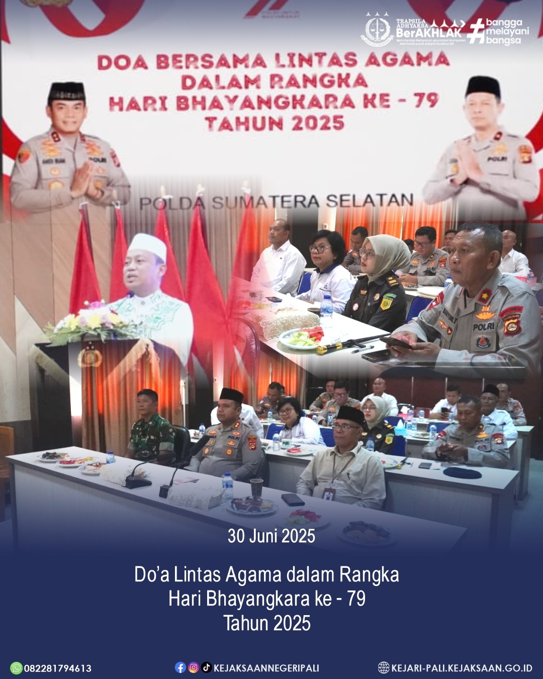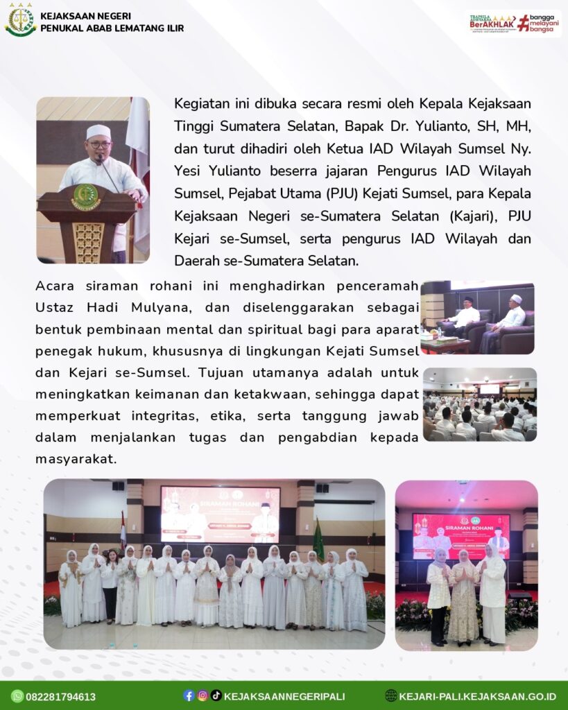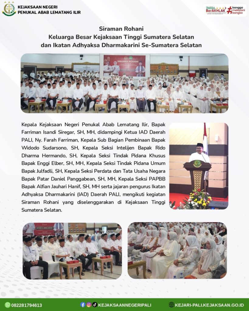 Kepala Kejaksaan Negeri Penukal Abab Lematang Ilir Bapak Farriman Isandi Siregar, SH, MH didampingi Ketua IAD Daerah PALI Ny. Farah Farriman, Kasubagbin dan Para Kasi, serta jajaran pengurus Ikatan Adhyaksa Dharmakarini (IAD) Daerah PALI mengikuti kegiatan Siraman Rohani di Kejaksaan Tinggi Sumatera Selatan dengan Penceramah Ustad Hadi Mulyana. Kegiatan tersebut dibuka eleh Kepala Kejaksaan Tinggi Sumatera Selatan Bapak Dr. Yulianto, SH, MH, yang juga dihadiri oleh seluruh PJU Kejati Sumsel, Kajari se Sumsel dan PJU Kejari se Sumsel, serta Pengurus IAD Wilayah dan Daerah se-Sumsel.