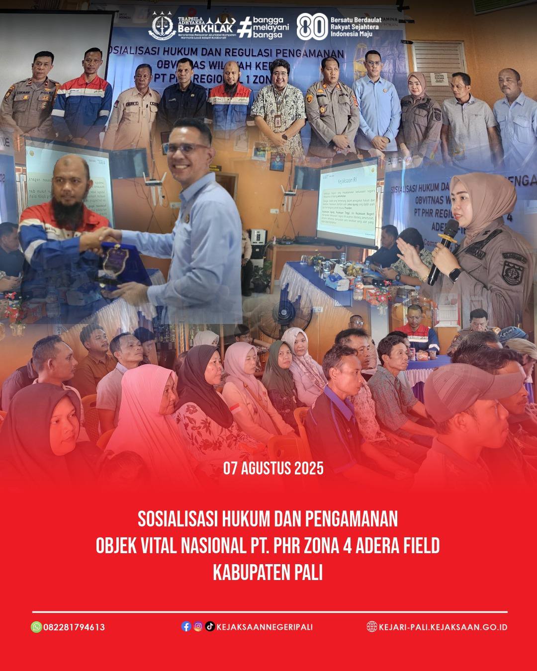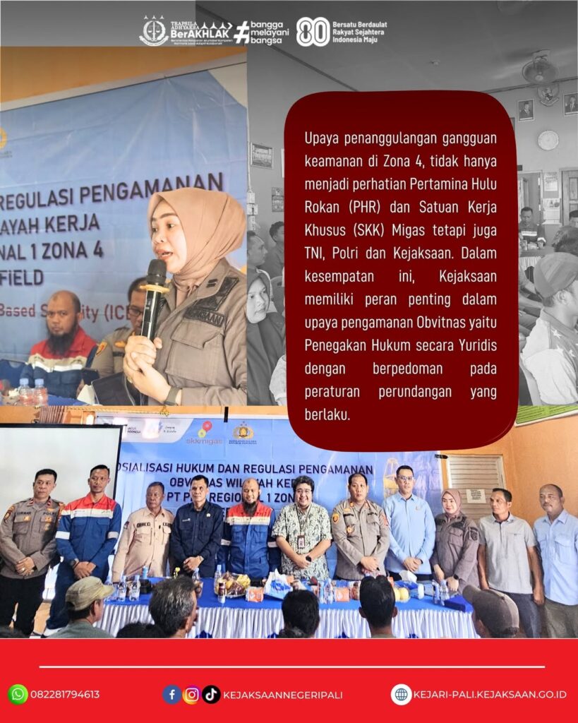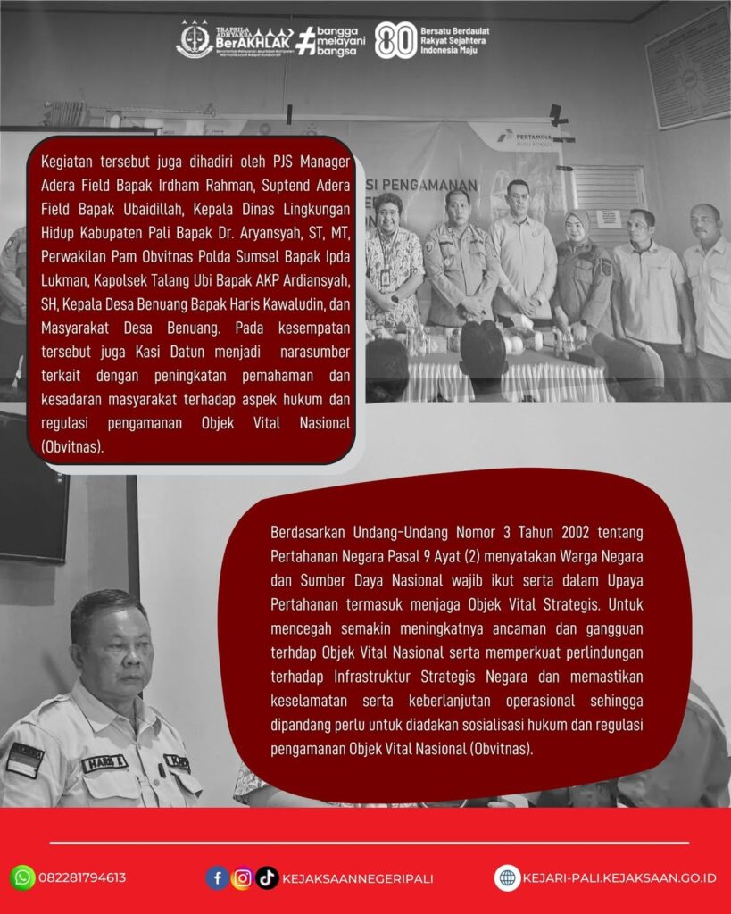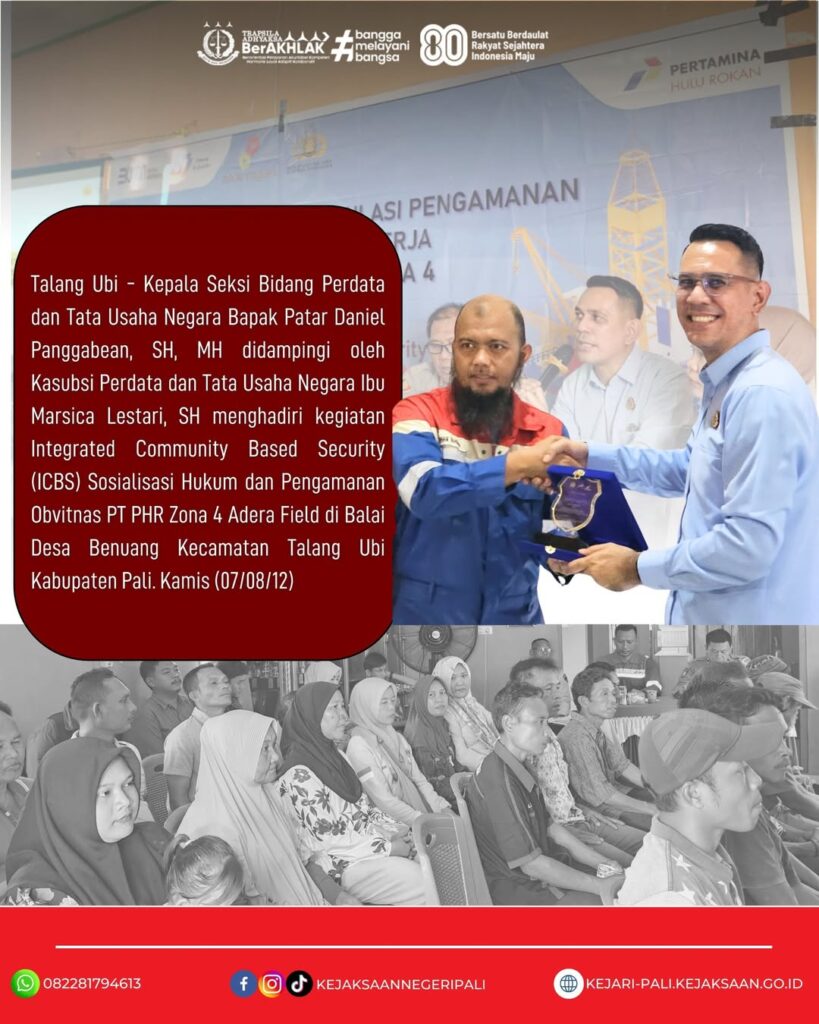 Kepala Seksi Bidang Perdata dan Tata Usaha Negara Bapak Patar Daniel Panggabean, SH, MH didampingi oleh Kasubsi Perdata dan Tata Usaha Negara Ibu Marsica Lestari, SH menghadiri kegiatan Integrated Community Based Security (ICBS) Sosialisasi Hukum dan Pengamanan Obvitnas PT PHR Zona 4 Adera Field di Balai Desa Benuang Kecamatan Talang Ubi Kabupaten PALI. Kegiatan tersebut juga dihadiri oleh PJS Manager Adera Field Bapak Irdham Rahman, Suptend Adera Field Bapak Ubaidillah, Kepala Dinas Lingkungan Hidup Kabupaten Pali Bapak Dr. Aryansyah, ST, MT, Perwakilan Pam Obvitnas Polda Sumsel Bapk Ipda Lukman, Kapolsek Talang Ubi Bapak AKP Ardiansyah, SH, Kepala Desa Benuang Bapak Haris Kawaludin, dan Masyarakat Desa Benuang.