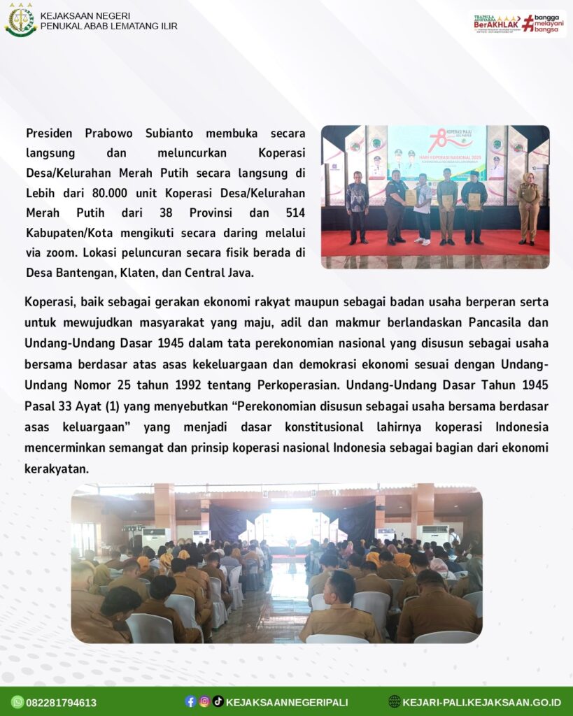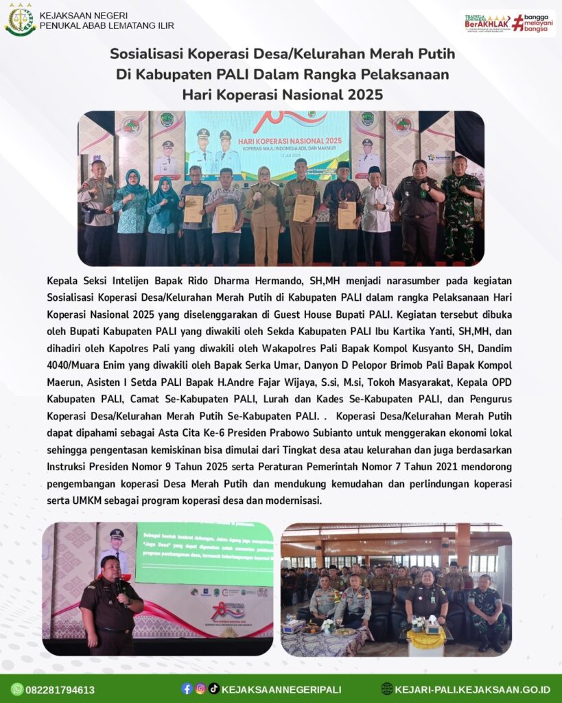 Kepala Seksi Intelijen Bapak Rido Dharma Hermando, SH,MH menjadi narasumber pada kegiatan Sosialisasi Koperasi Desa/Kelurahan Merah Putih di Kabupaten PALI dalam rangka Pelaksanaan Hari Koperasi Nasional 2025 yang diselenggarakan di Guest House Bupati PALI. Kegiatan tersebut dibuka oleh Bupati Kabupaten PALI yang diwakili oleh Sekda Kabupaten PALI Ibu Kartika Yanti, SH,MH, dan dihadiri oleh Kapolres Pali yang diwakili oleh Wakapolres Pali Bapak Kompol Kusyanto SH, Dandim 4040/Muara Enim yang diwakili oleh Bapak Serka Umar, Danyon D Pelopor Brimob Pali Bapak Kompol Maerun, Asisten I Setda PALI Bapak H.Andre Fajar Wijaya, S.si, M.si, Tokoh Masyarakat, Kepala OPD Kabupaten PALI, Camat Se-Kabupaten PALI, Lurah dan Kades Se-Kabupaten PALI, dan Pengurus Koperasi Desa/Kelurahan Merah Putih Se-Kabupaten PALI.