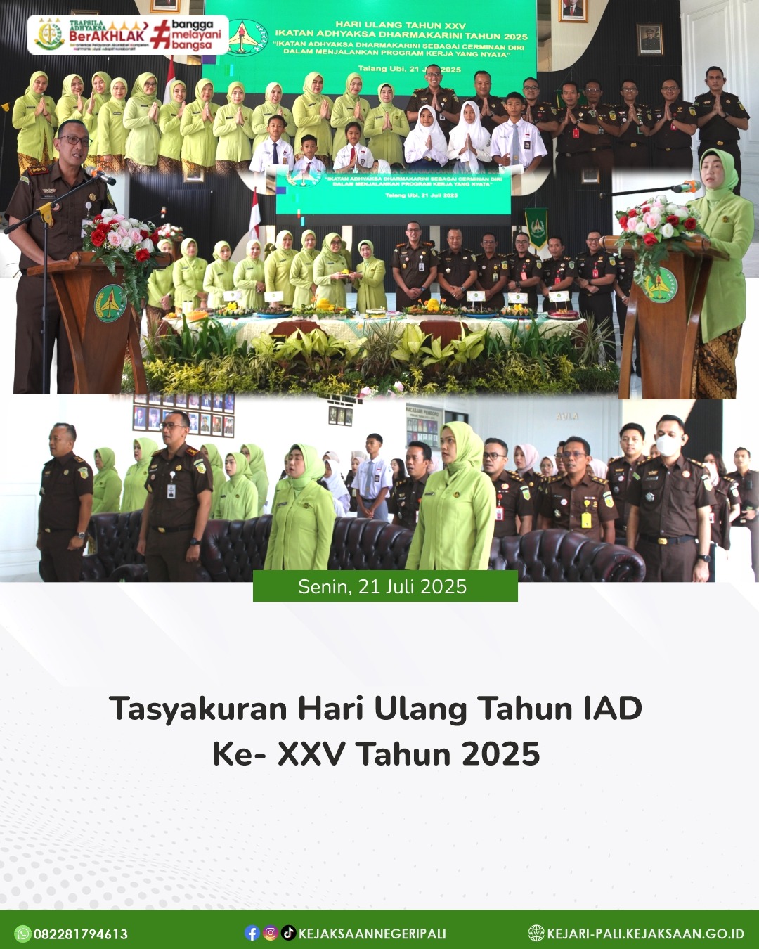 Kepala Kejaksaan Negeri PALI Bapak Farriman Isandi Siregar, SH, MH selaku pengawas IAD Daerah PALI menghadiri kegiatan Tasyakuran Hari Ulang Tahun IAD ke-XXV Tahun 2025. Kegiatan tersebut dihadiri oleh Ketua IAD Daerah PALI Ny. Farah Farriman, Kasubagbin dan Para Kasi, Ibu-Ibu Ketua Bidang, dan Anggota IAD Daerah PALI.